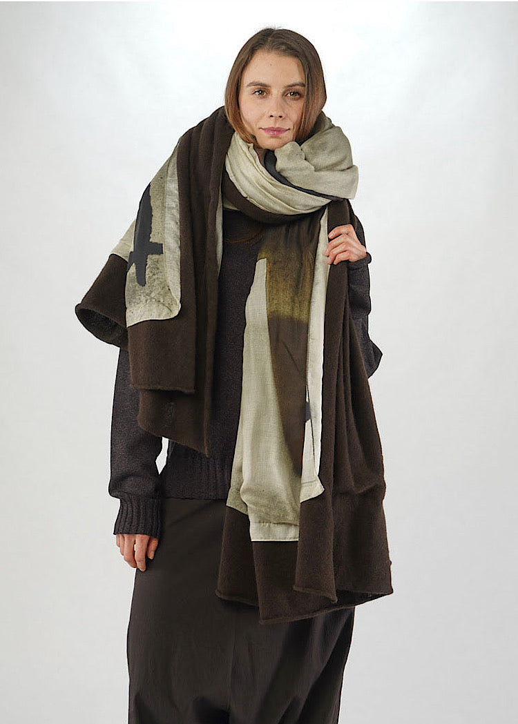 A weighted Modal-Wool Mix scarf in an abstract design, inspired by this Autumn/Winter's motif attached to a Wool panel in the tonal Turf colourway.