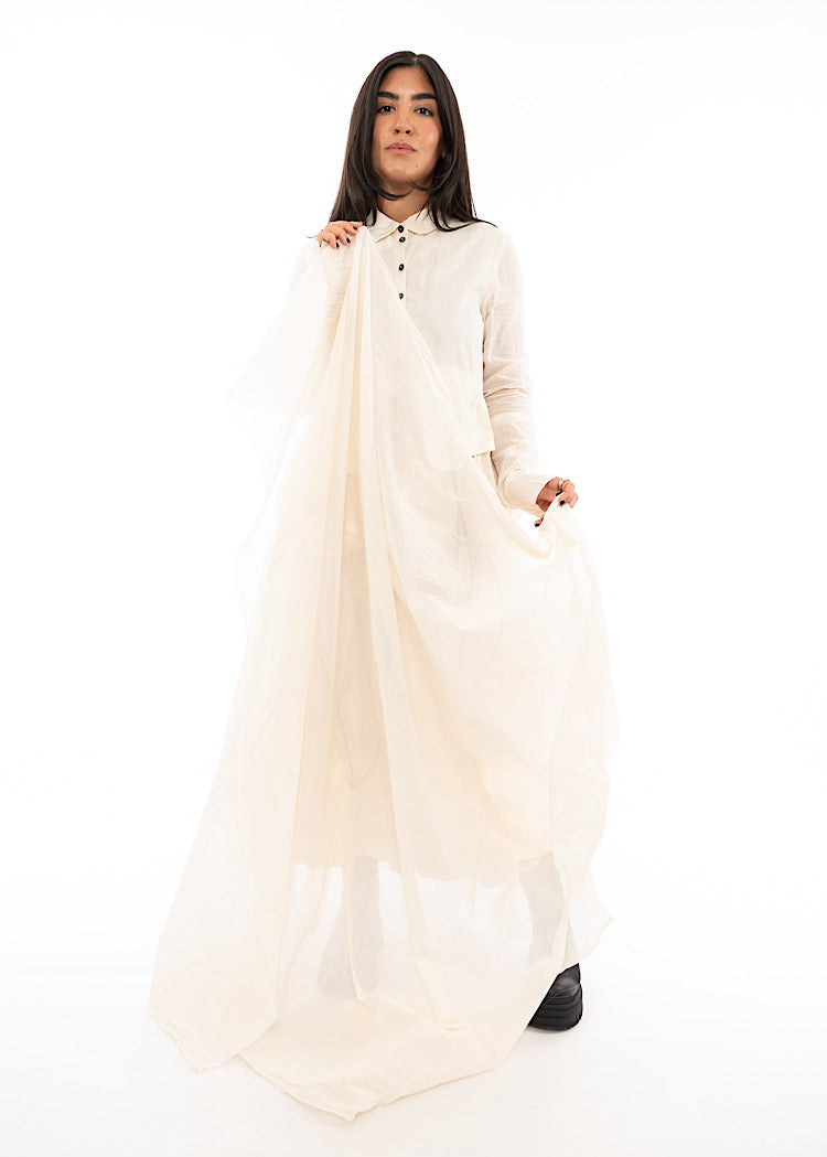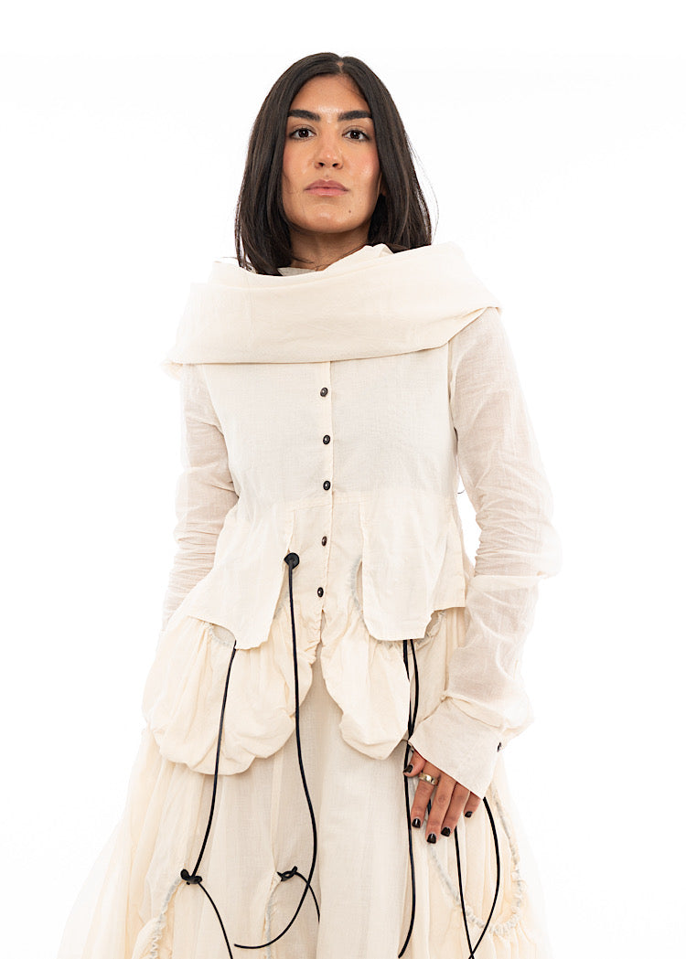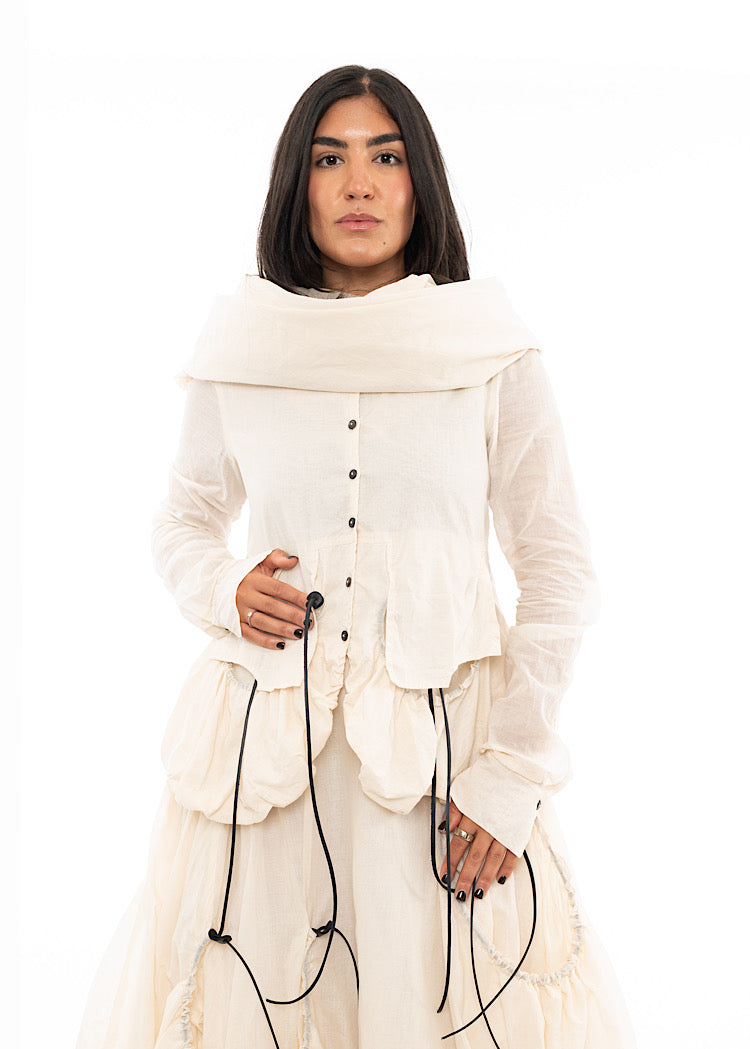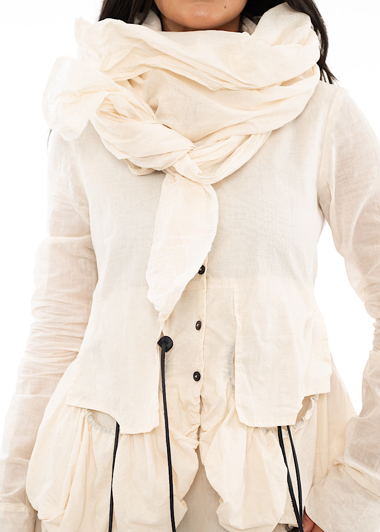 EDITOR'S NOTE : A statement in scale and softness, this RUNDHOLZ MAINLINE scarf allows for endless styling—drape, wrap, or layer it for volume and warmth. The crinkled texture and raw edges lend a casual, undone elegance that complements the collection’s sculptural direction.