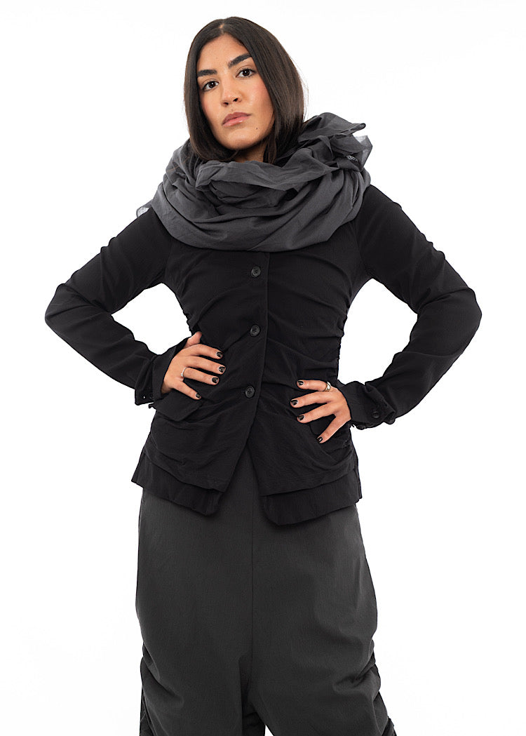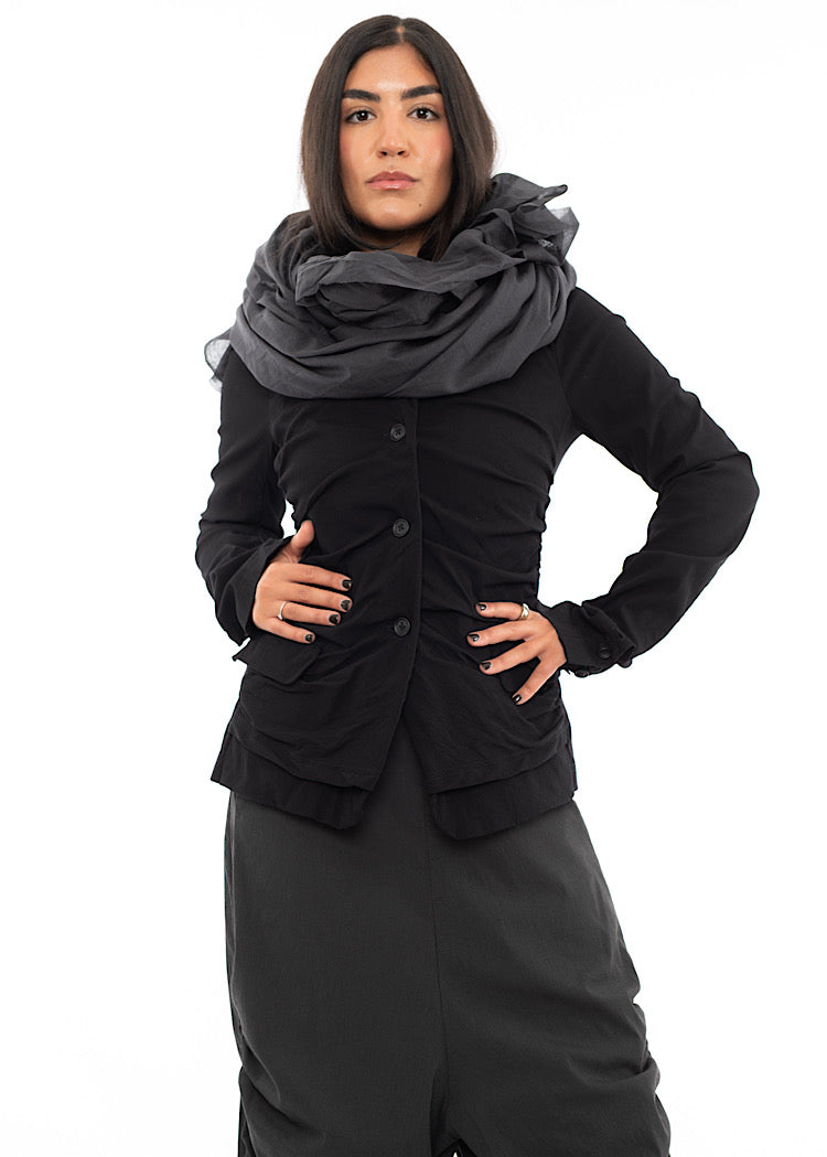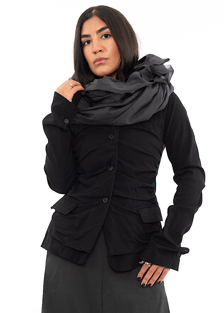 EDITOR'S NOTE : A statement in scale and softness, this RUNDHOLZ MAINLINE scarf allows for endless styling—drape, wrap, or layer it for volume and warmth. The crinkled texture and raw edges lend a casual, undone elegance that complements the collection’s sculptural direction.