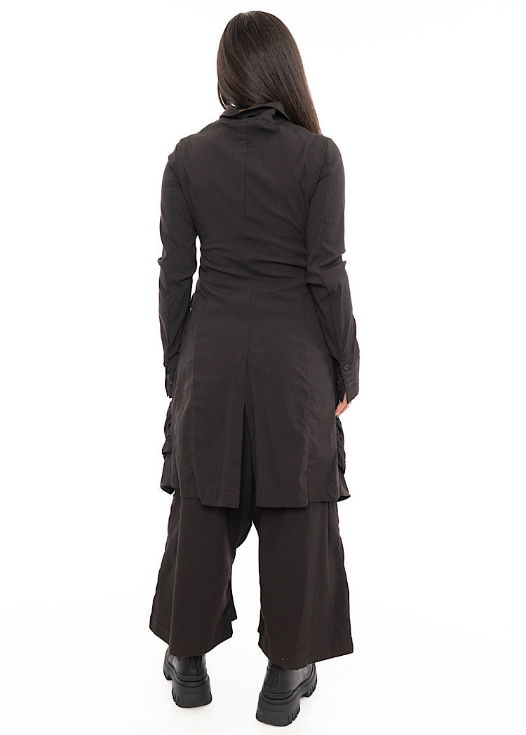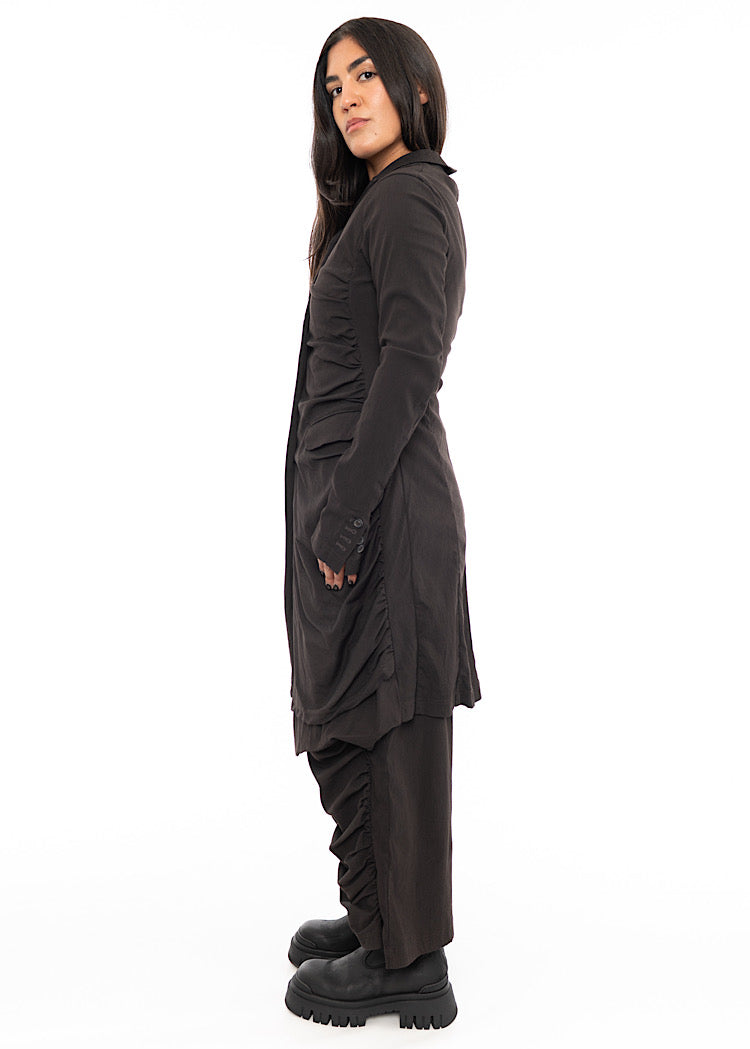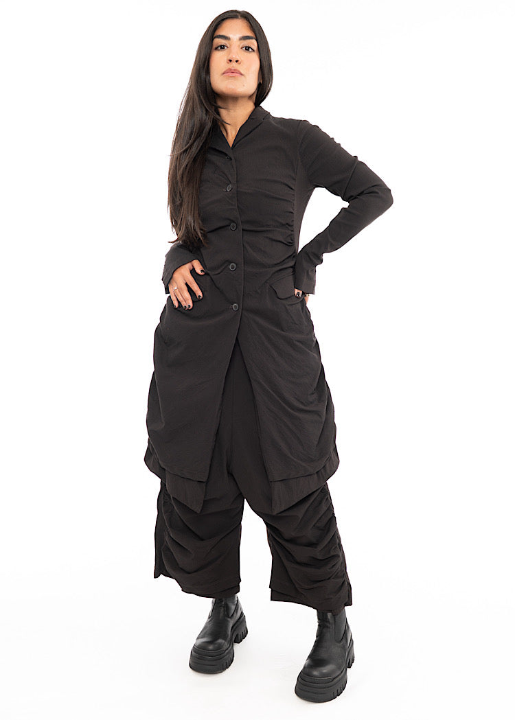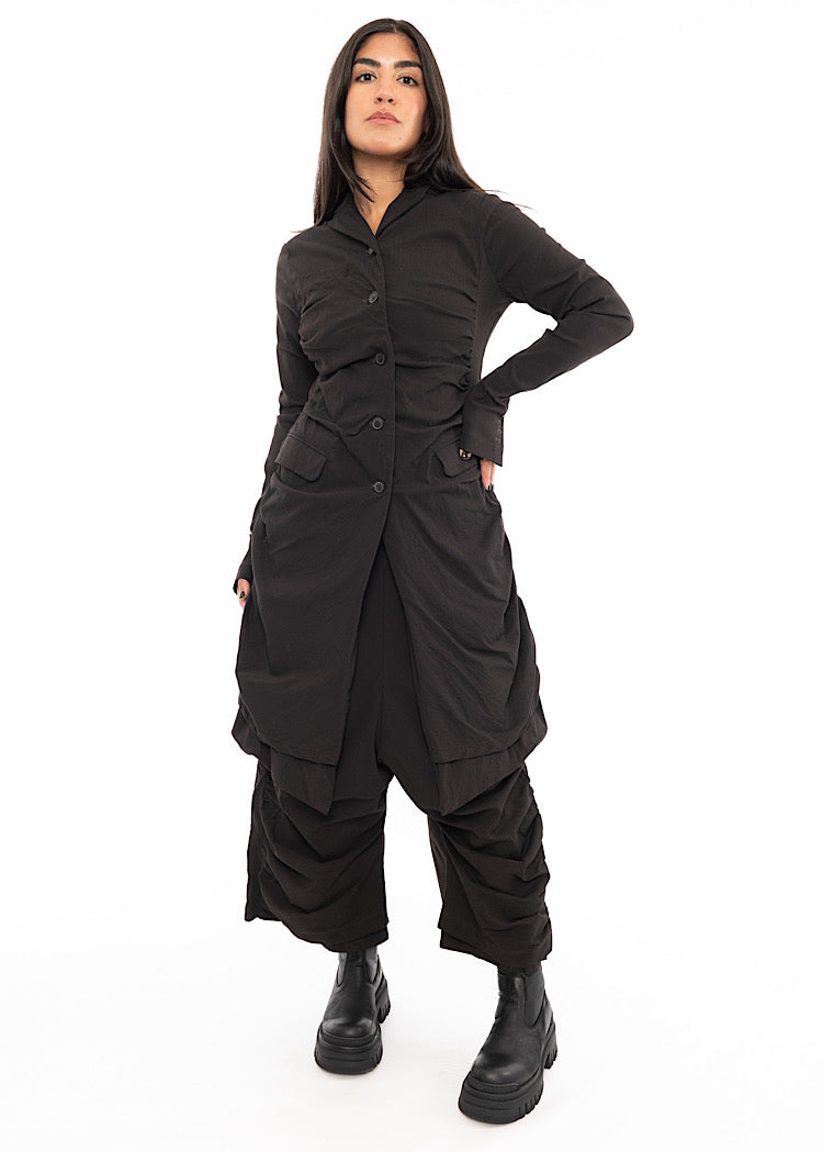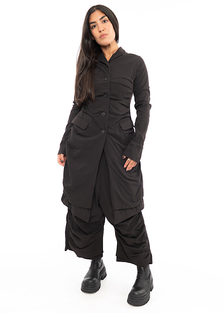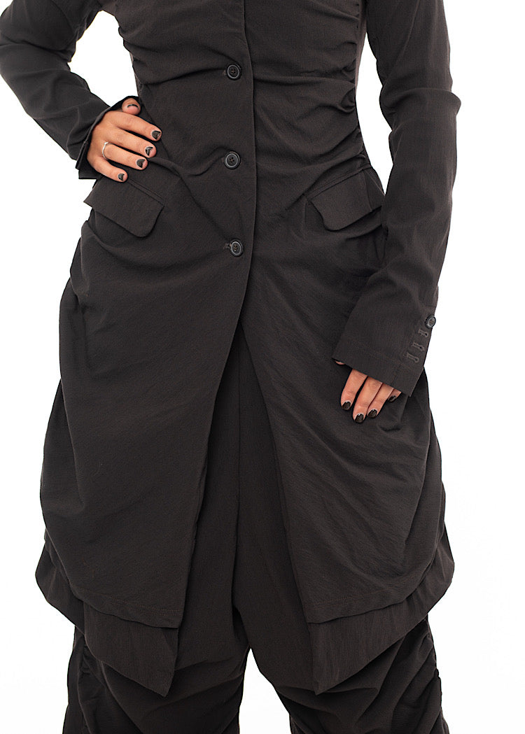EDITOR'S NOTE : This is classic RUNDHOLZ. A stretch-fit coat to take you anywhere. The ruched shaping brings that signature RUNDHOLZ structure we love! Pair it with the co-ordinating drop-crotch trousers or layer over the techno dress in matching ruched fabric for a full statement look.