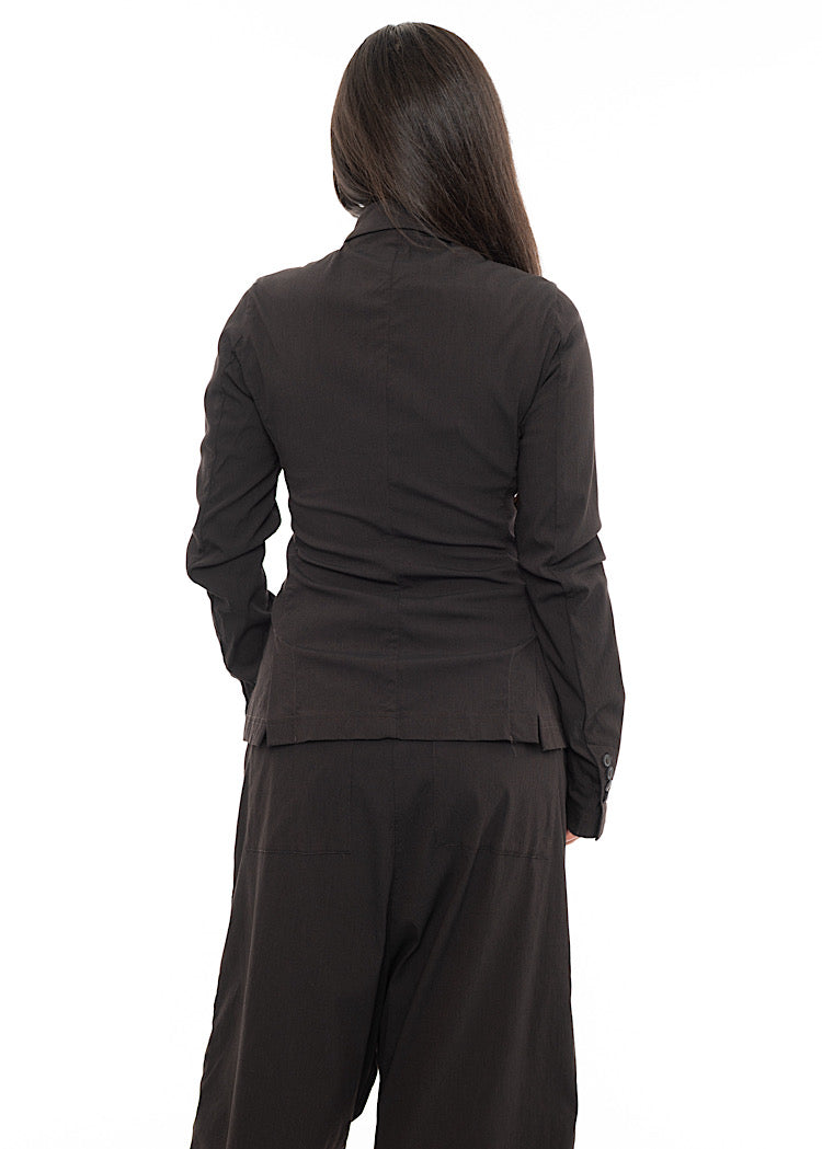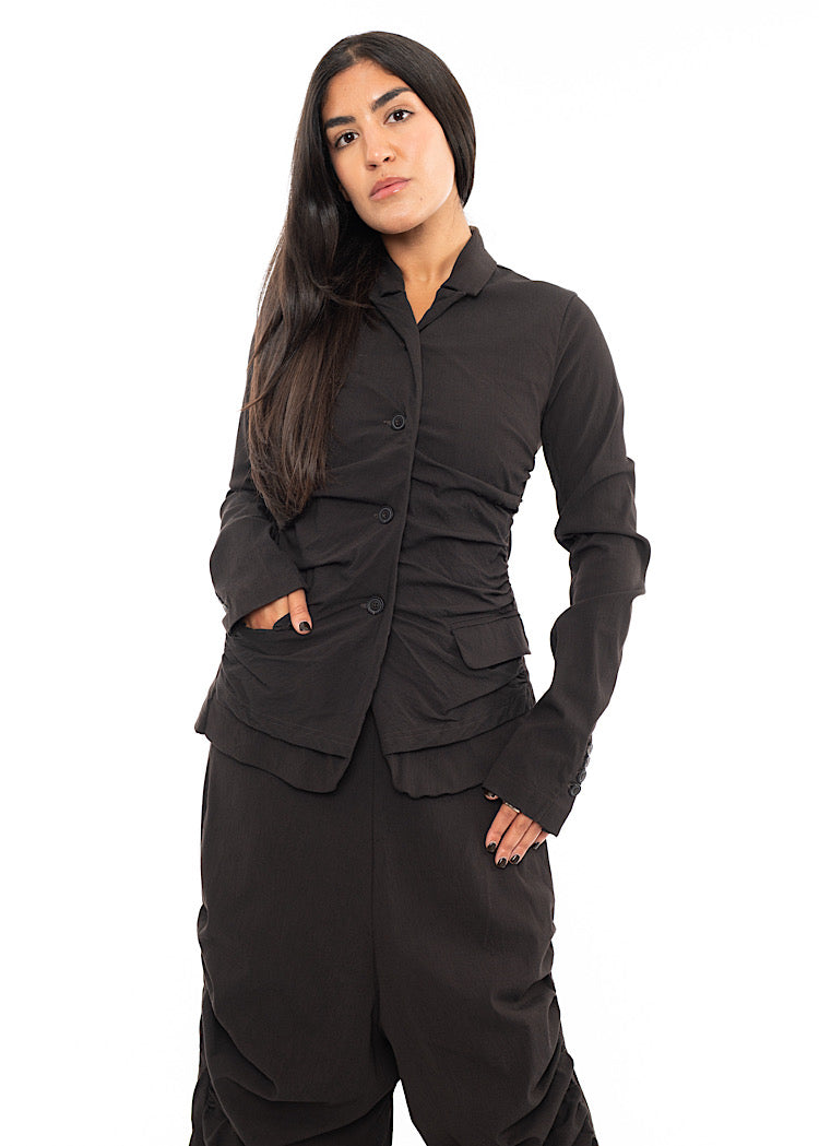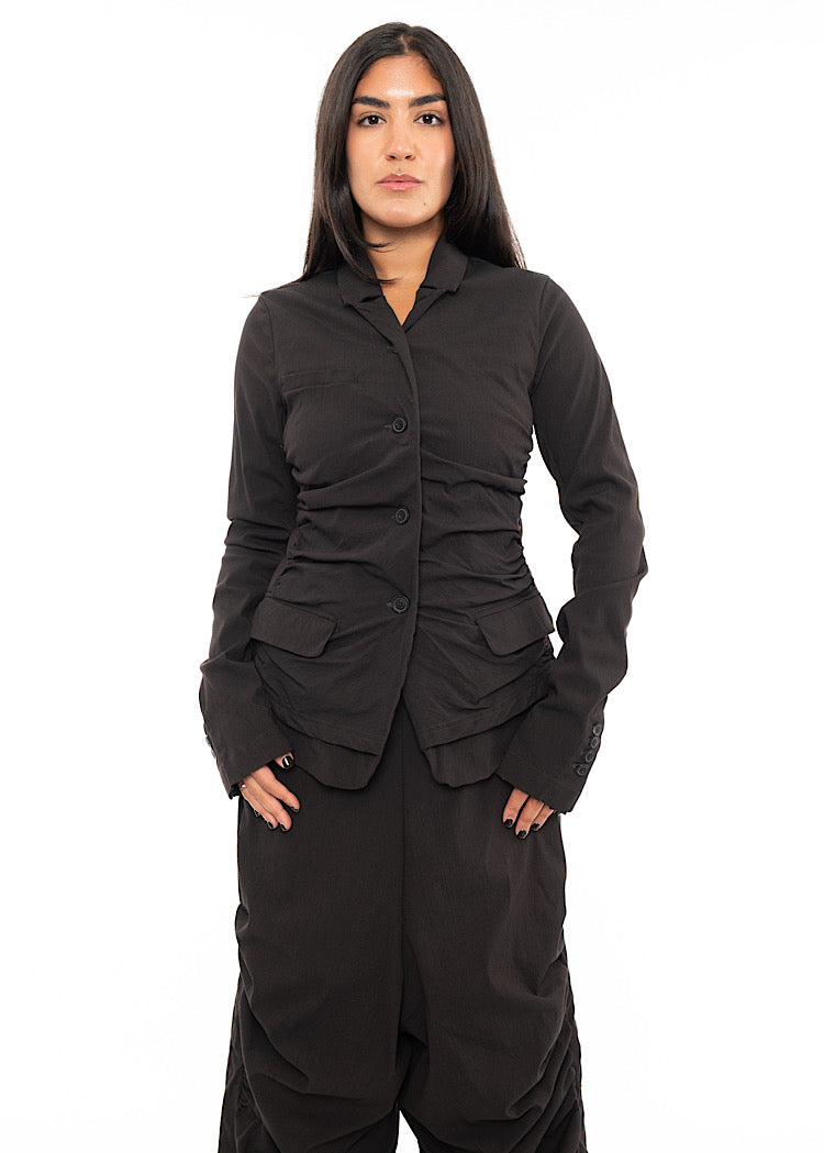 A sculptural, fitted jacket from RUNDHOLZ MAINLINE for Autumn/Winter '25, crafted in a structured Wool-blend. Designed with ruched side seams that contour the body and add architectural volume, this piece plays with proportion while maintaining a sharp, tailored silhouette. Features two front facing pockets, a neat collar and buttons to fasten.