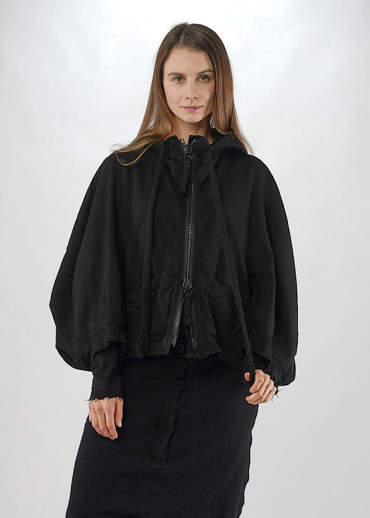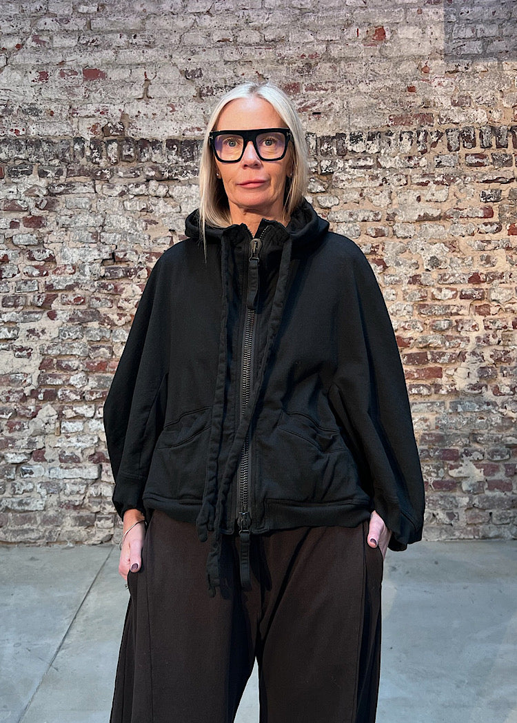 A relaxed-fit jacket from RUNDHOLZ MAINLINE, crafted in a medium-weight, sweatshirt-style Cotton for structure and comfort. Designed with an oversized silhouette, it features a drawstring funnel neckline with a statement hood, dropped shoulders and wide sleeves, finished with ribbed Cotton trims at the cuff and hem. Padded toggle details add a sculptural edge that nod to the season’s monstrous forms. Finished with a two-way zip to fasten and two front-facing pockets.