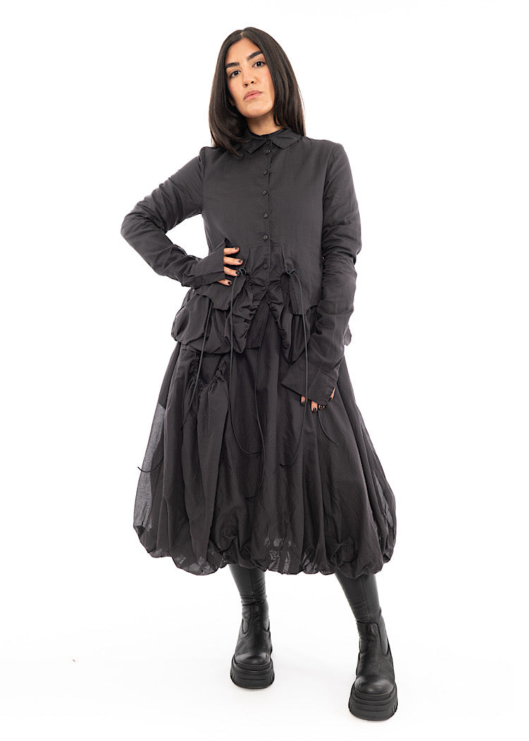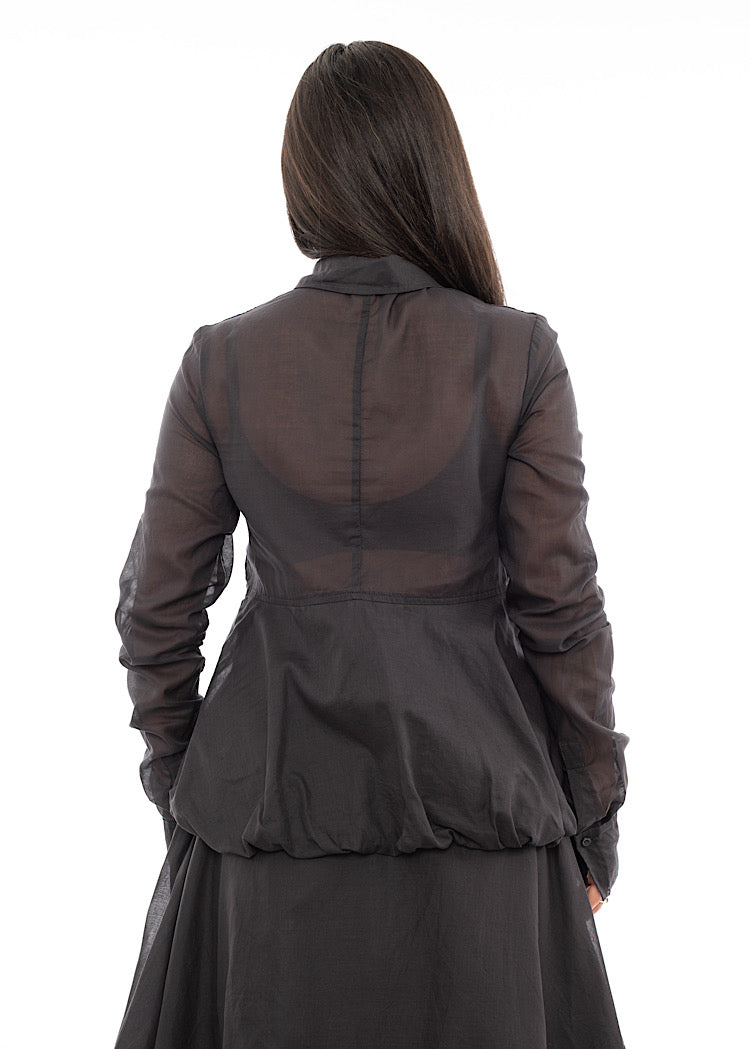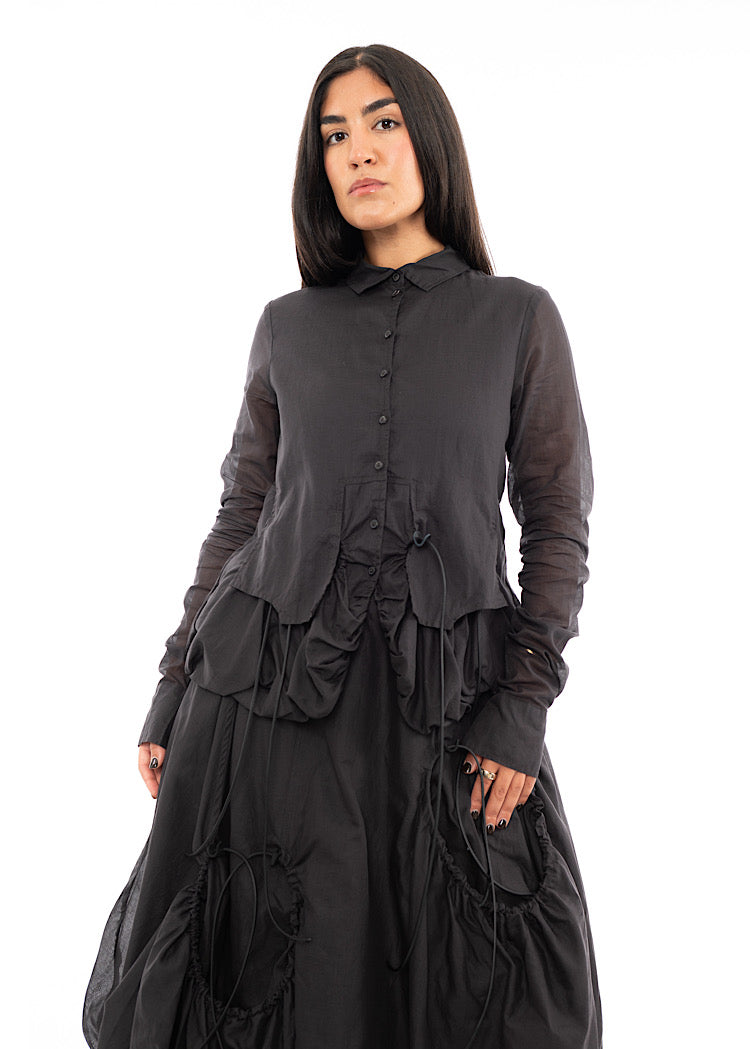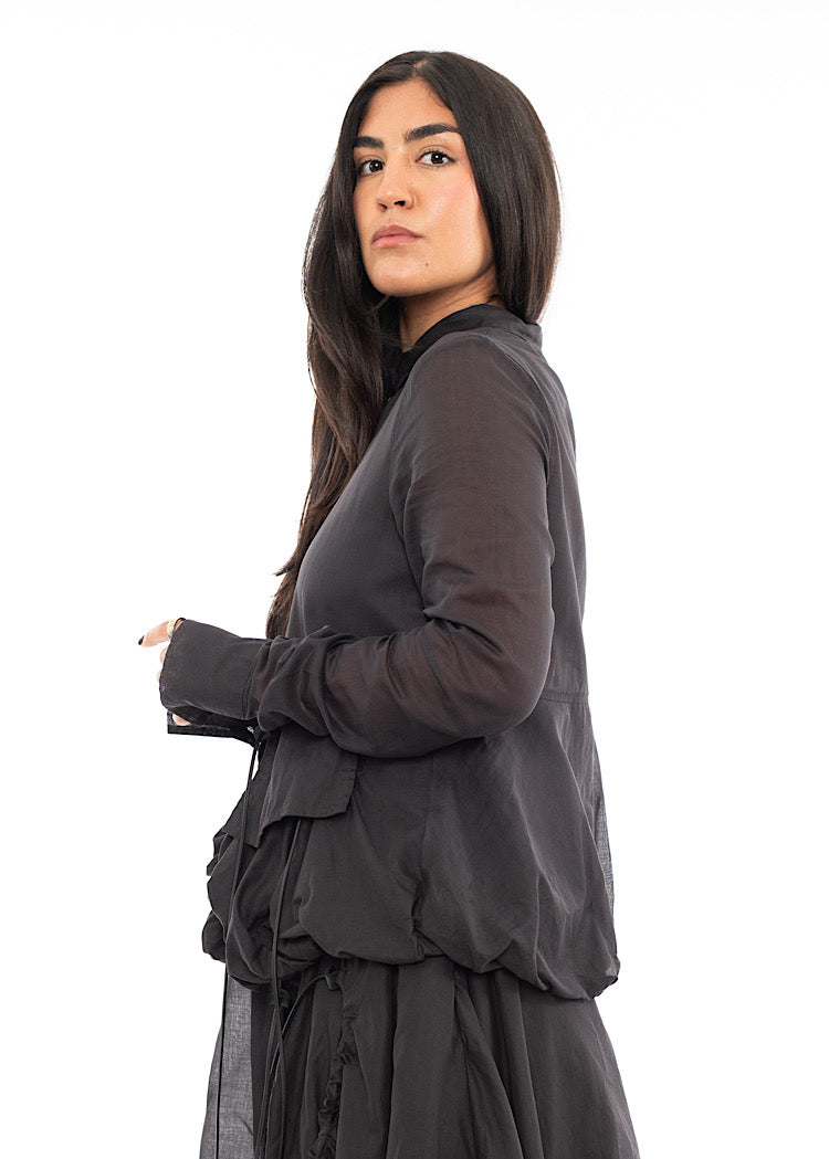 EDITOR'S NOTE : RUNDHOLZ MAINLINE takes a classic silhouette and reworks it with sculptural drawstrings and subtle sheerness for added edge. We love the contrast between the crisp gathers at the waist and the fluidity of the semi-sheer sleeves. Wear it loose for drama or cinch it in to play with shape—it’s a versatile piece that brings quiet complexity to any look.
