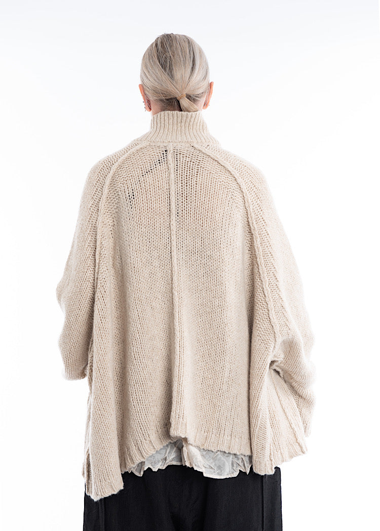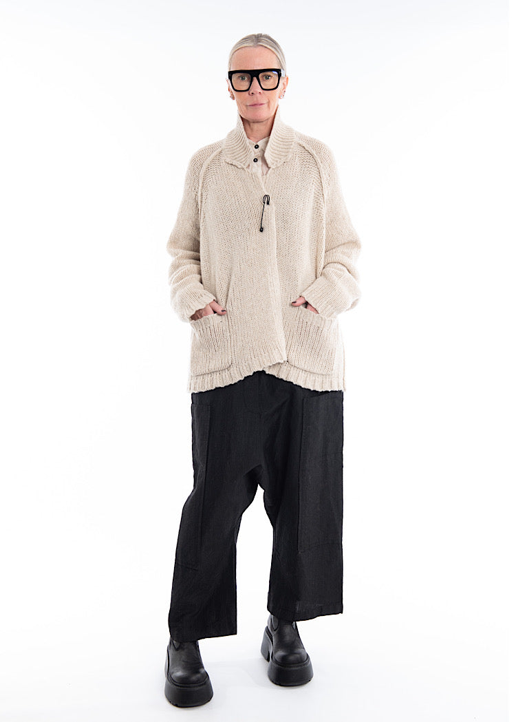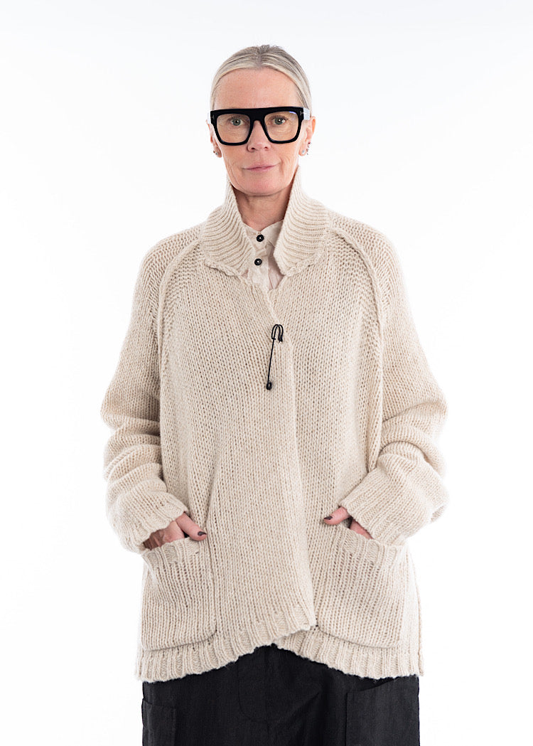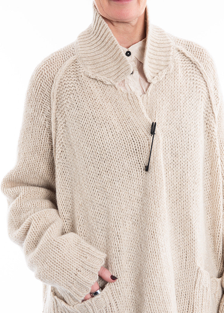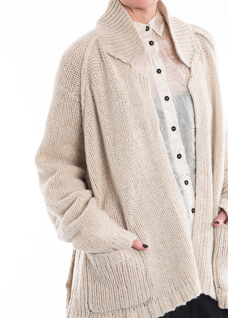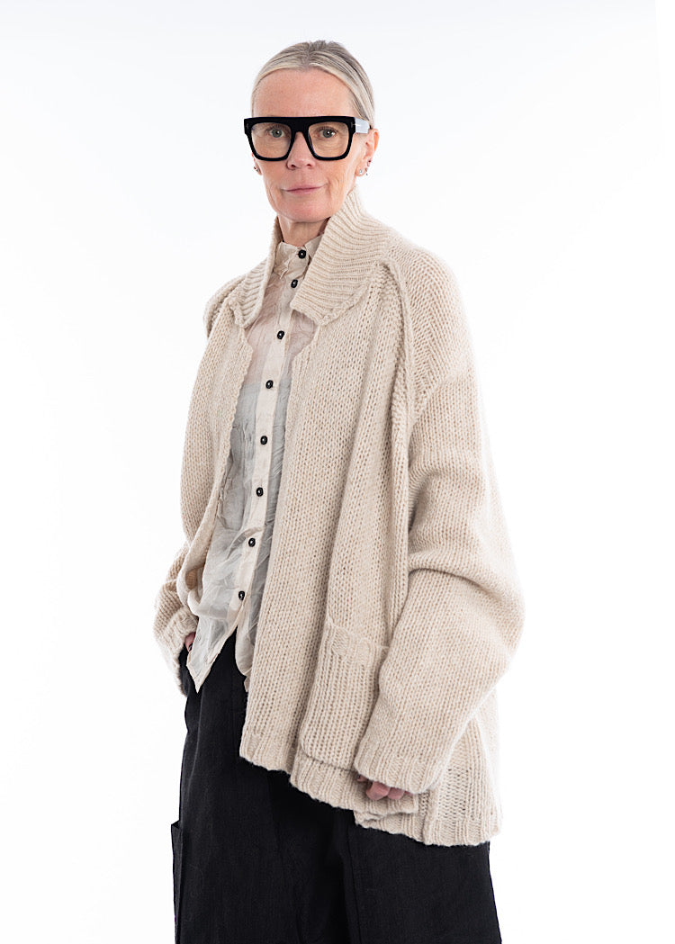 A swingy, oversized style Cardigan from RUNDHOLZ MAINLINE in a knitted wool fabric. Features an open front with collared neckline, long sleeves with dropped shoulders and seam details. Finished with two front facing pockets, ribbed hemline and a RUNDHOLZ pin to secure from the front if desired.