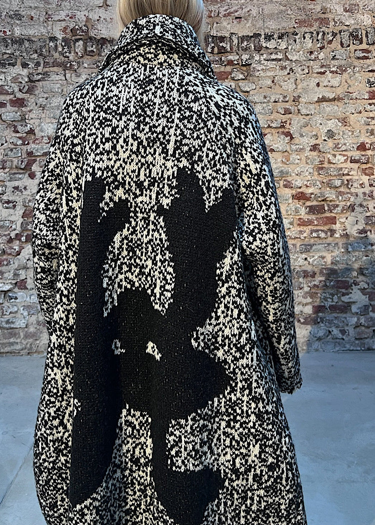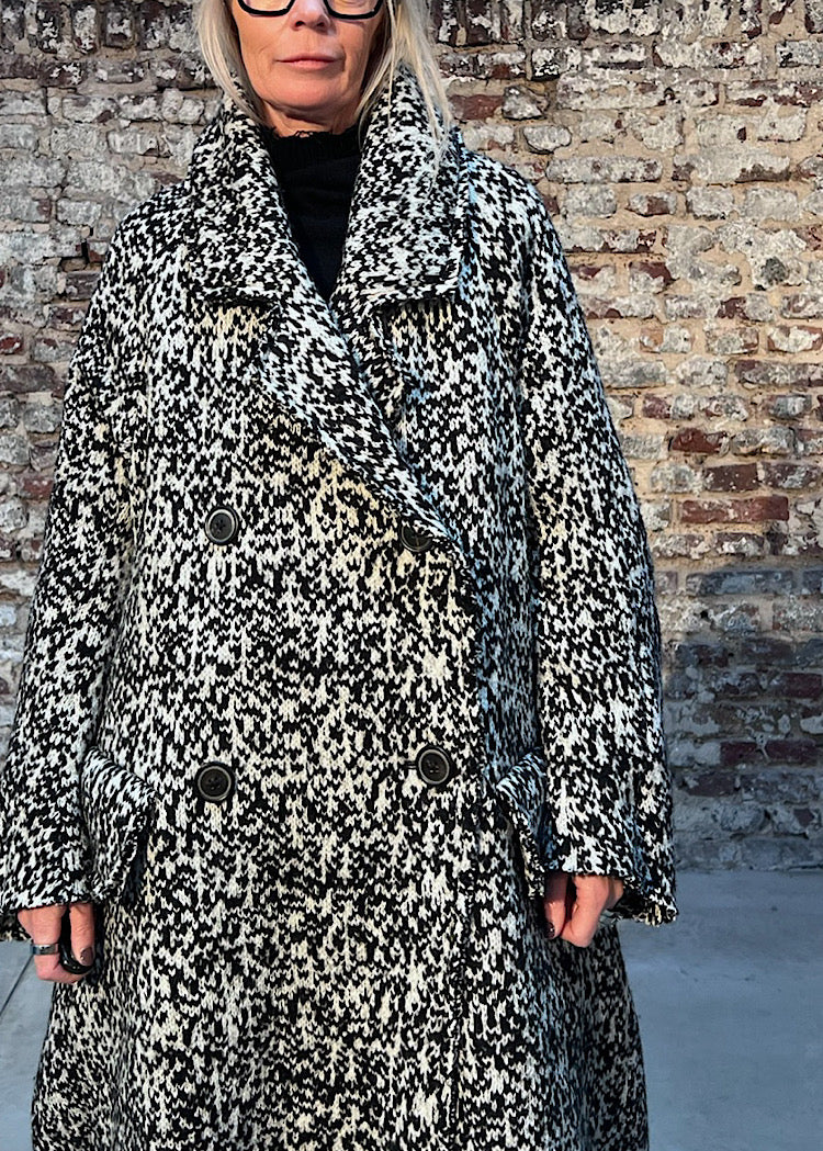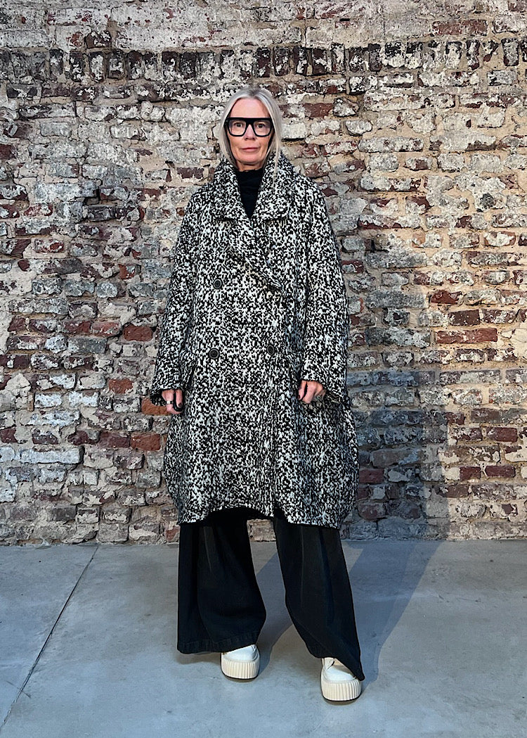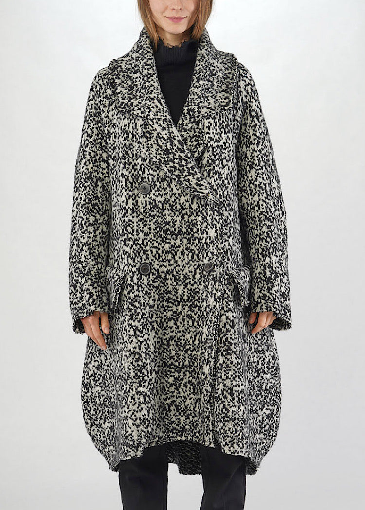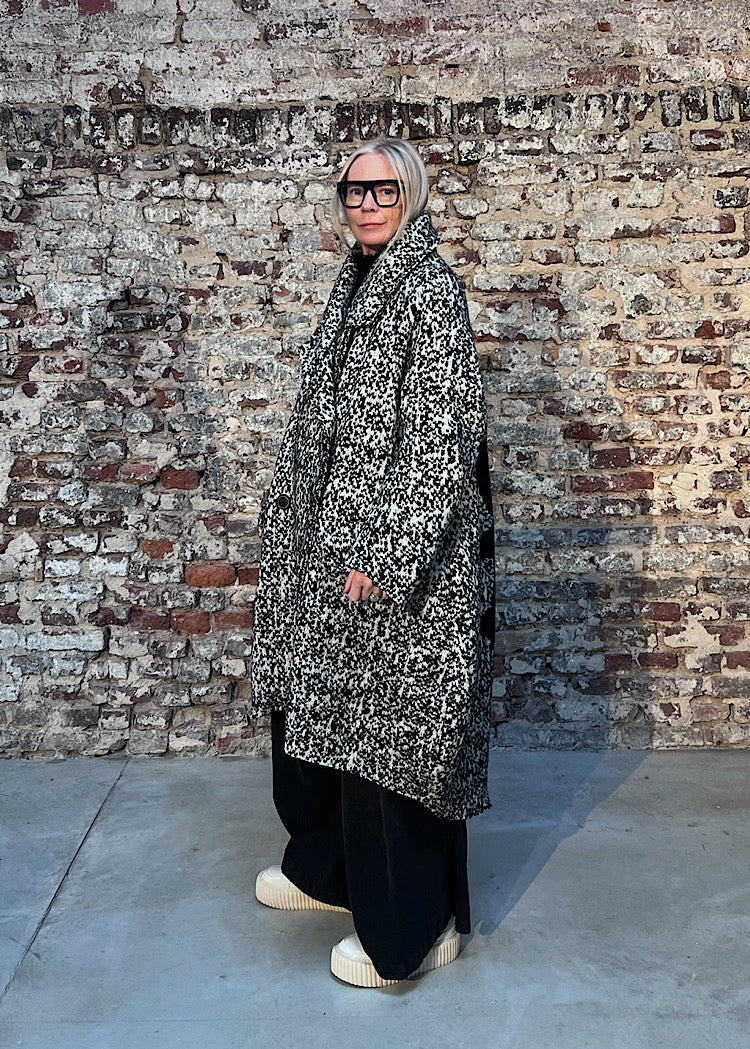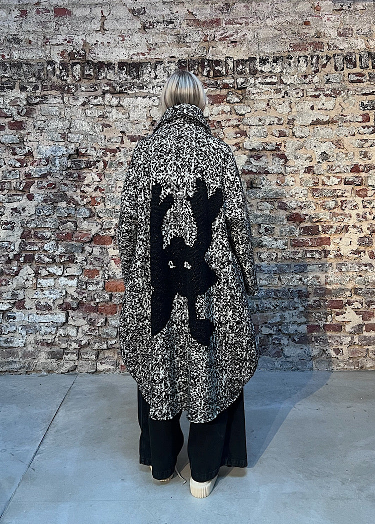 A signature outerwear piece from the RUNDHOLZ MAINLINE AW25 collection, this oversized jacquard coat is crafted in a textured Wool-Yak blend with a bold, speckled black and chalk weave. The exaggerated cocoon silhouette is enhanced by dropped shoulders, wide sleeves, and a double-breasted button front.