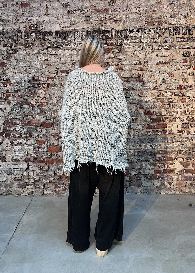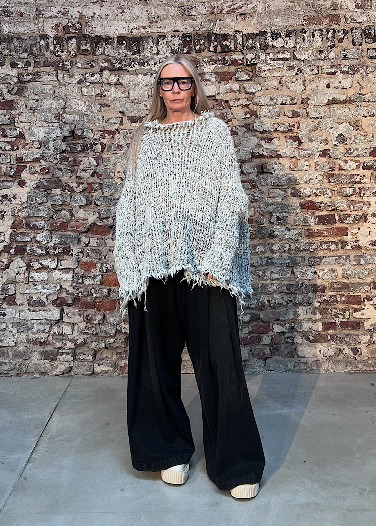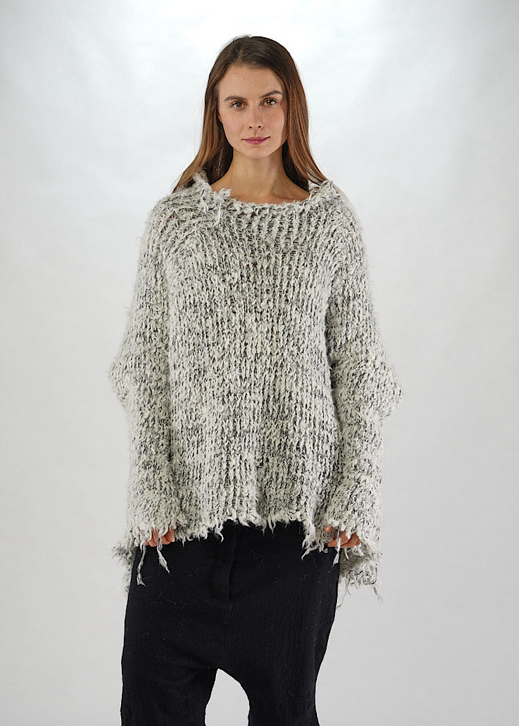 An oversized, open weave pullover from RUNDHOLZ MAINLINE in a luxurious Alpaca-Blend yarn. Features a high neckline, dropped shoulders, long length sleeves and a scooped hemline. Finished with raw, distressed edges that echo the label’s signature deconstructed aesthetic.
