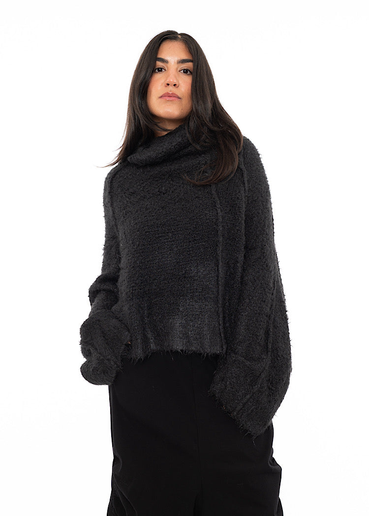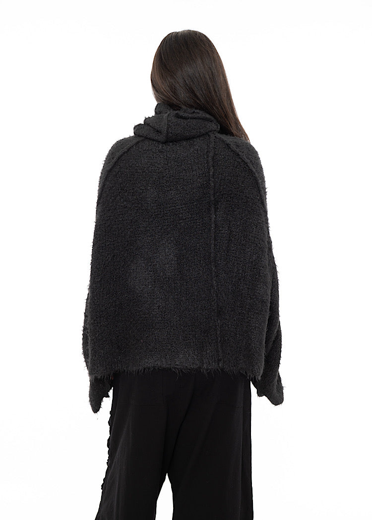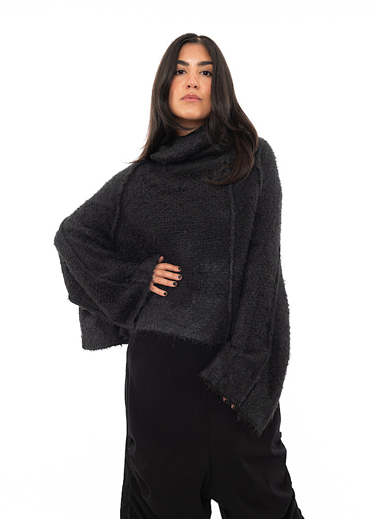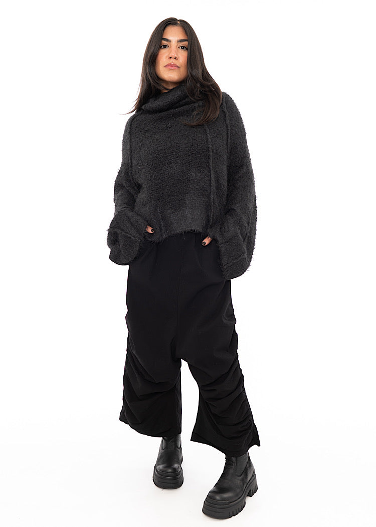 A Model wearing a washed Grey Pullover, including features of a relaxed turtle neck and wide long sleeves. Paired with Black Trousers.