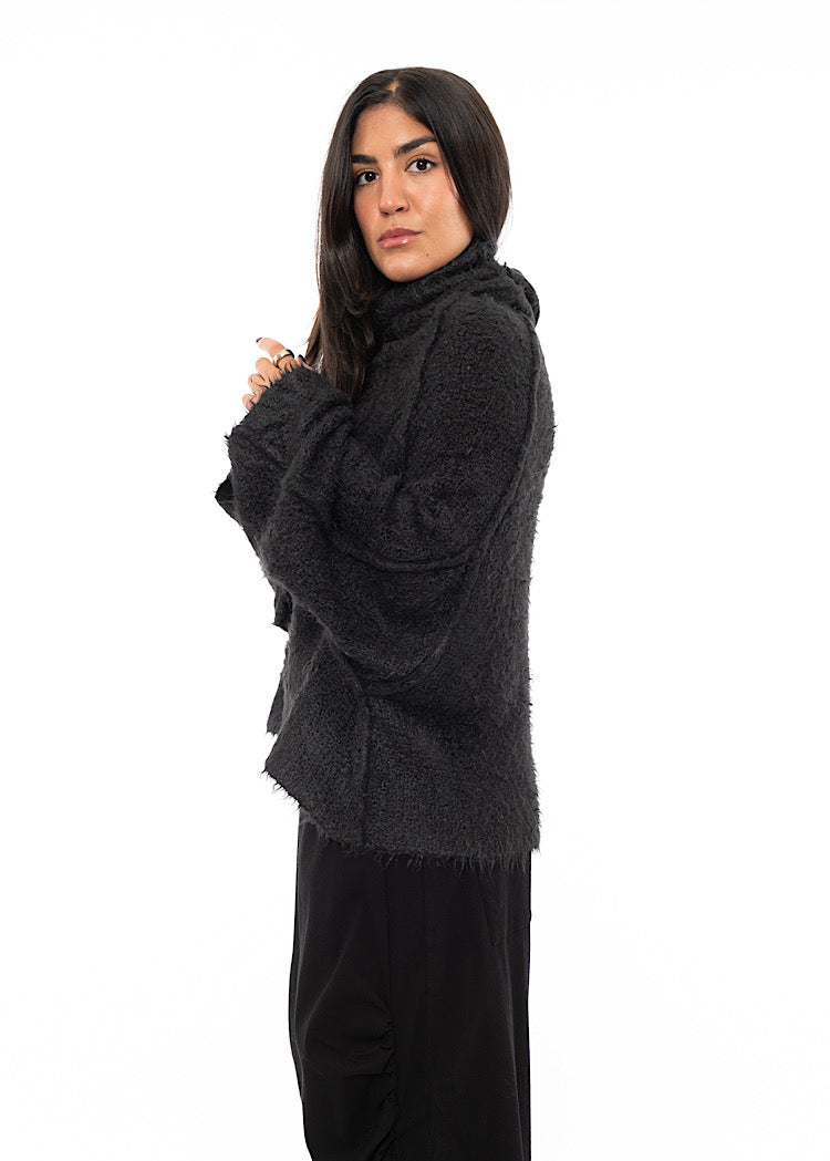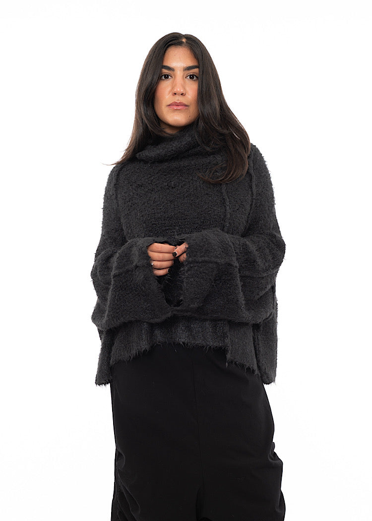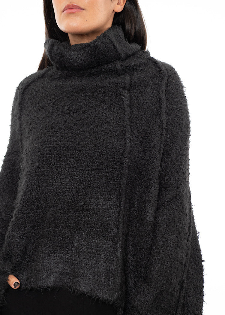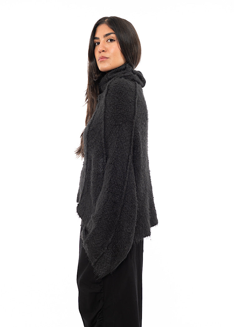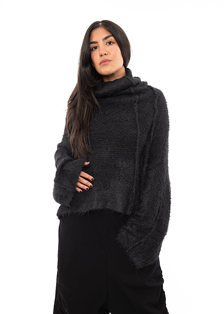 A Model wearing a washed Grey Pullover, including features of a relaxed turtle neck and wide long sleeves. Paired with Black Trousers.
