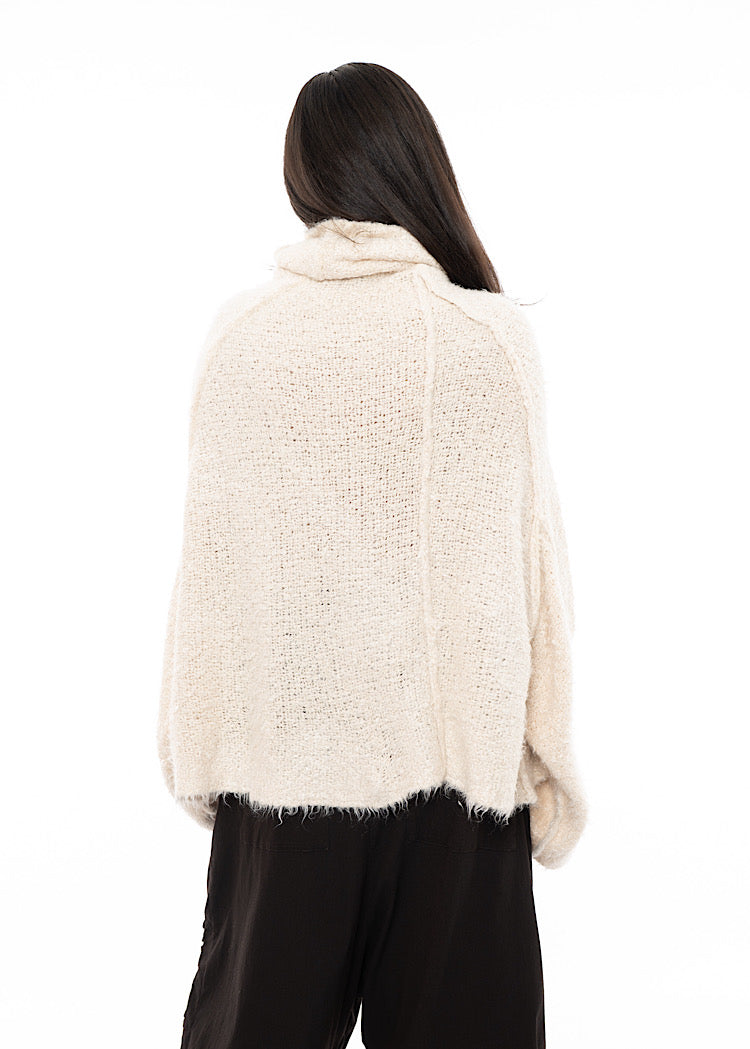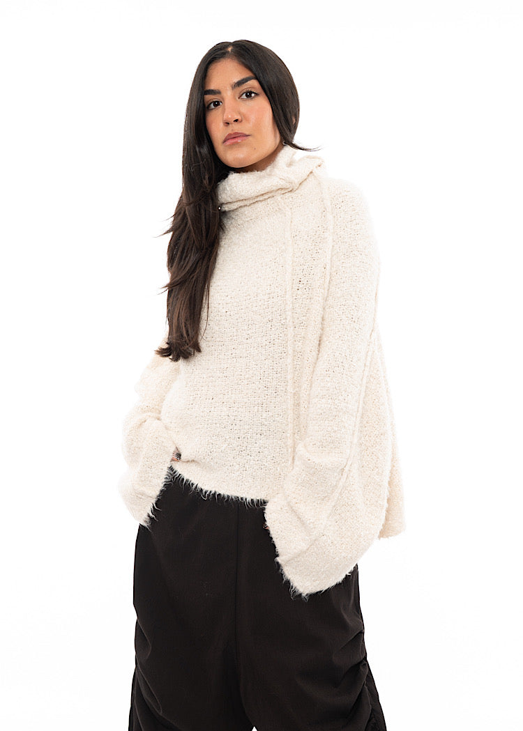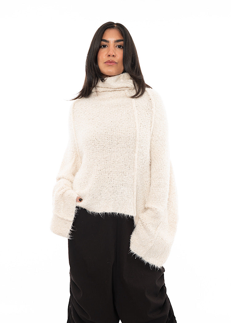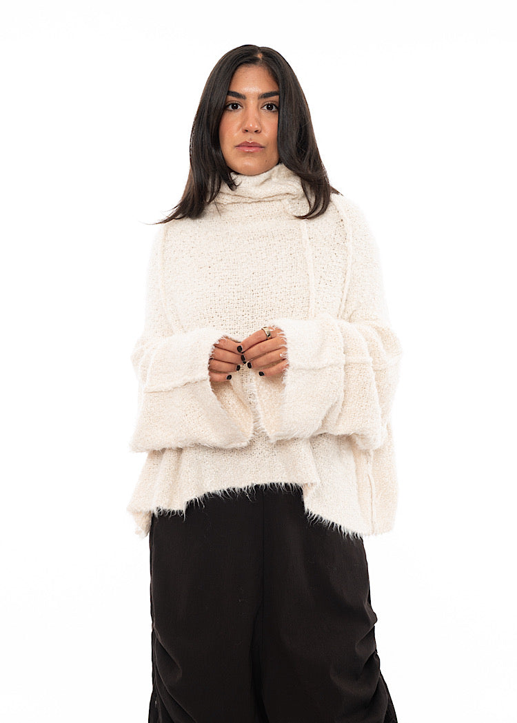 EDITOR'S NOTE : This is the kind of knit that defines a winter wardrobe. The exaggerated funnel neck and wide sleeves feel cocooning without being bulky, while the tactile texture adds dimension to even the simplest look. We recommend styling these oversized pullovers with a drop-crotch trouser for a relaxed, oversized look or style with a fitted skirt for a neater silhouette.