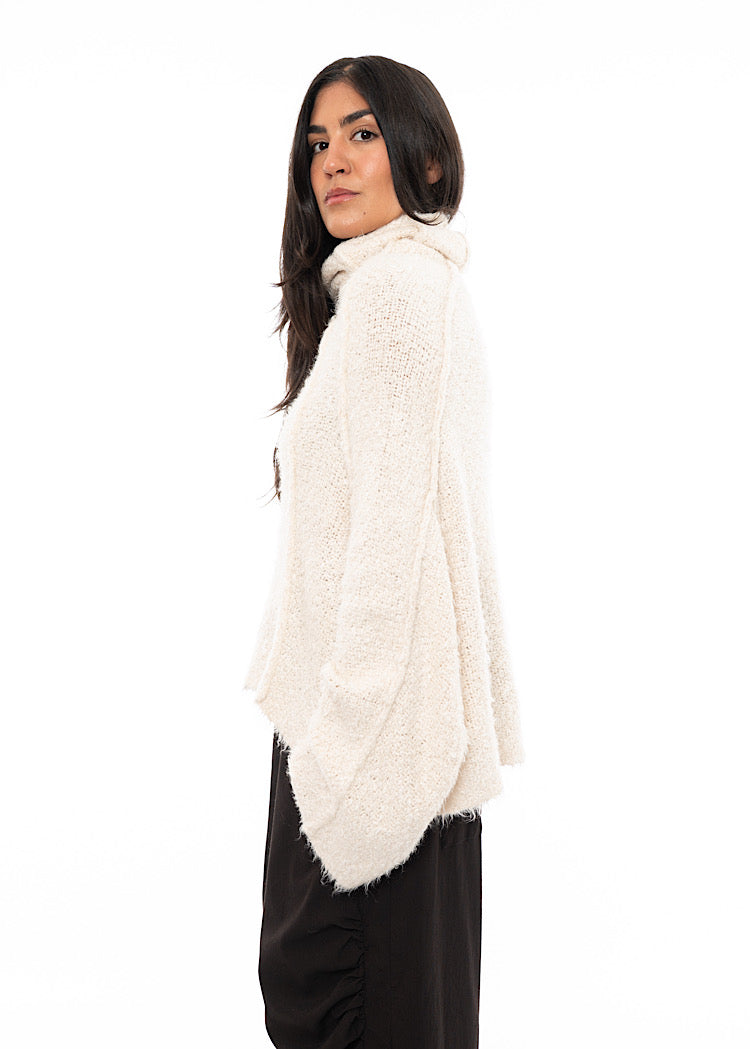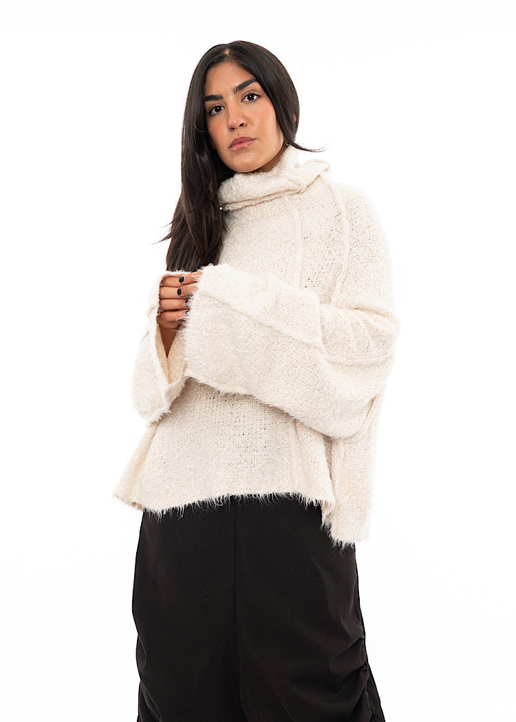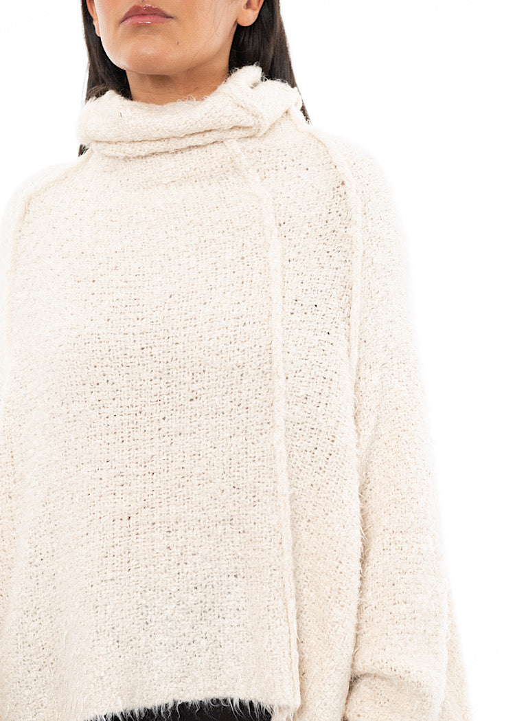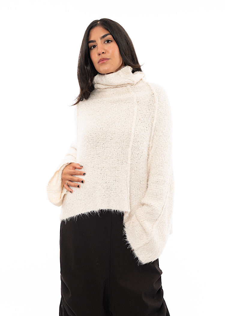EDITOR'S NOTE : This is the kind of knit that defines a winter wardrobe. The exaggerated funnel neck and wide sleeves feel cocooning without being bulky, while the tactile texture adds dimension to even the simplest look. We recommend styling these oversized pullovers with a drop-crotch trouser for a relaxed, oversized look or style with a fitted skirt for a neater silhouette.