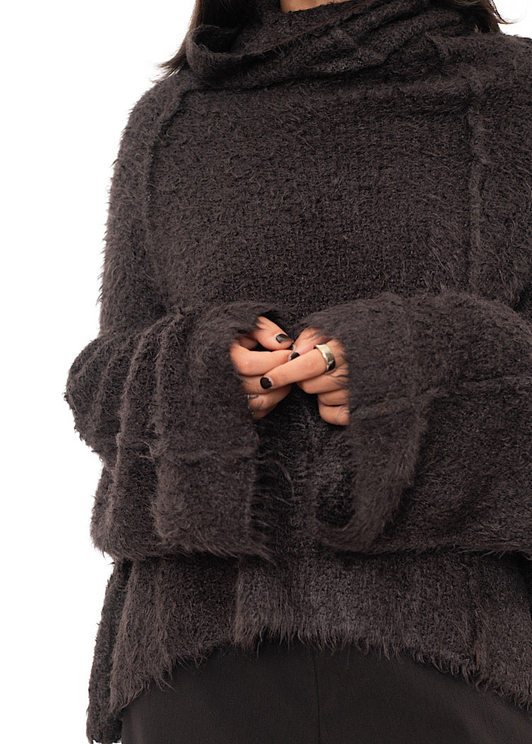 Inspired by the raw, untamed essence of monsters, the RUNDHOLZ MAINLINE Autumn/Winter '25 collection reimagines monstrosity as power, through exaggerated silhouettes, asymmetry, and sculptural layering. Otherworldly yet functional, this season Carsten Rundholz transforms the unknown into wearable form. An oversized pullover from RUNDHOLZ MAINLINE, crafted in 100% Silk for a luxurious, tactile finish. This Autumn/Winter knit features exposed seam detailing, a high neckline, dropped shoulders, and extra-long sleeves. The asymmetric hemline adds movement and structure, highlighting the collection’s focus on raw texture and unconventional form.
