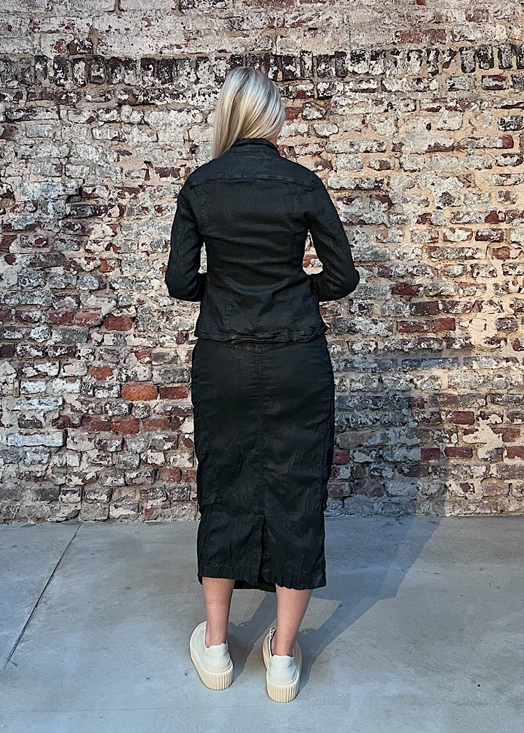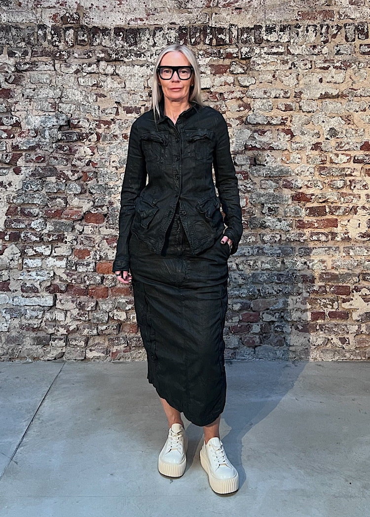 EDITOR'S NOTE : This season, Rundholz reintroduces the classic techno skirt. Available in both Black Gloss and Turf Wash, Carsten Rundholz presents us with an impossible choice. The Black Gloss offers a waxed, distressed finish adding edge to the skirt's feminine, structured silhouette. The Turf Wash, more in line with RUNDHOLZ’s classic denim, feels understated and effortless, an ideal everyday piece.