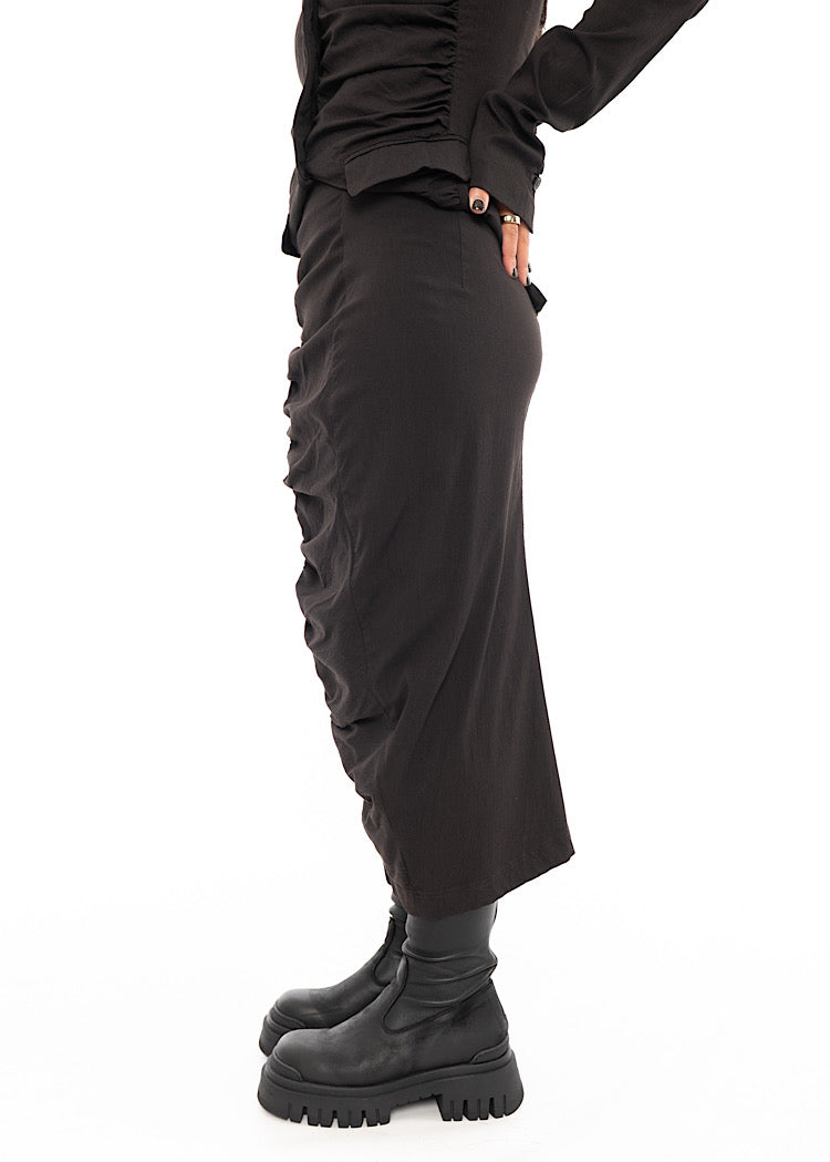 A staple skirt from RUNDHOLZ MAINLINE for Autumn/Winter '25, crafted in a stretchy Wool-Mix fabric. Elevated with a ruched panel, this piece creates a sculptural, body-skimming silhouette.