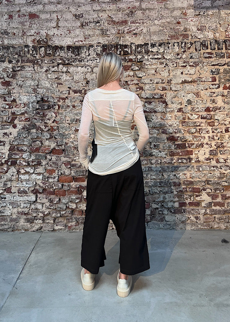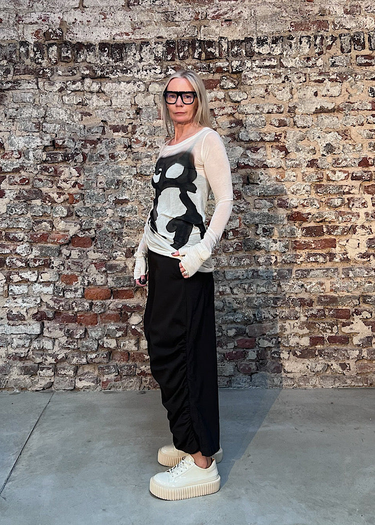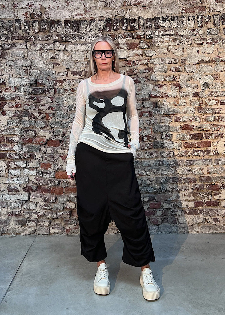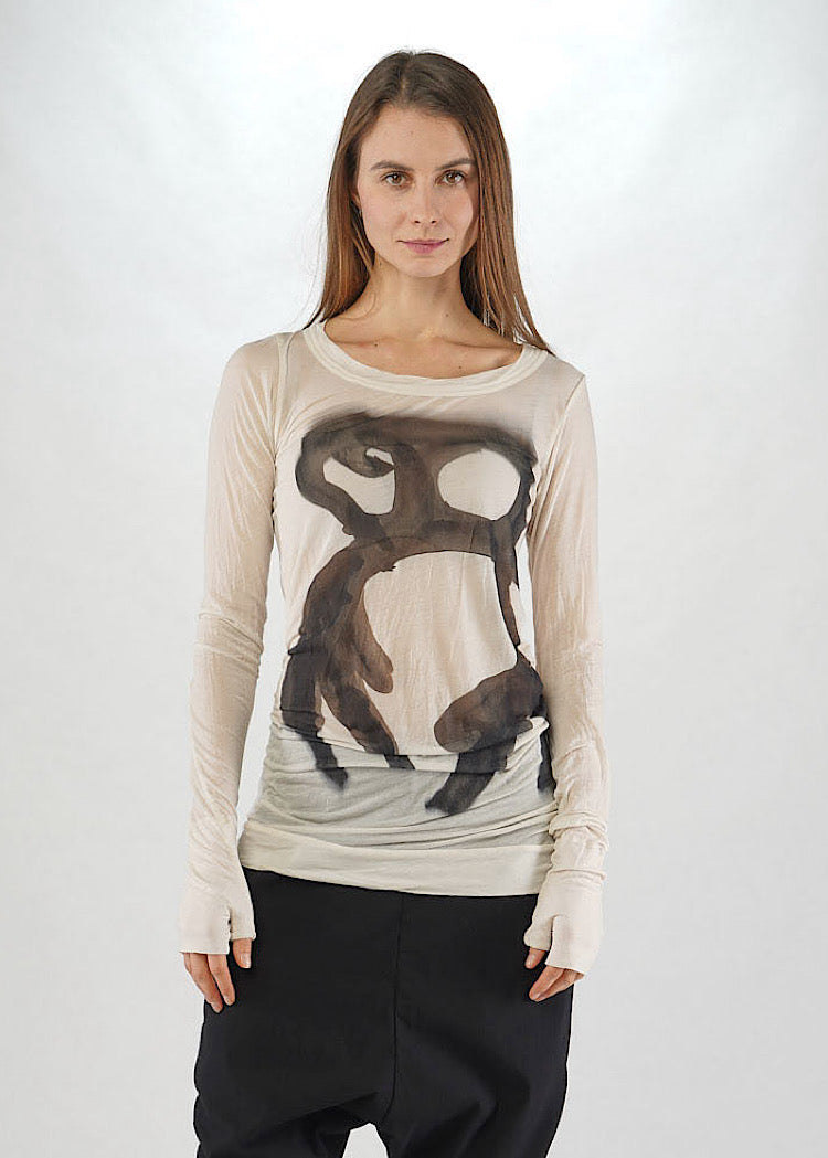 Crafted from a featherlight Silk-Mix jersey, this sheer long-sleeve top from RUNDHOLZ MAINLINE is an elevated essential with an edge. Featuring a bold abstract ink motif on a soft bone base, it layers easily under knits or stands alone as a statement. Features a round neckline and an attached cuff detail.