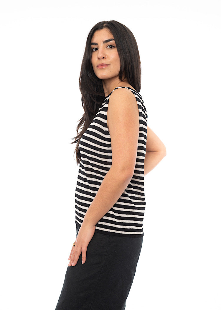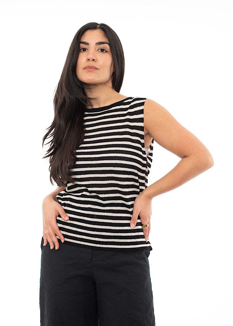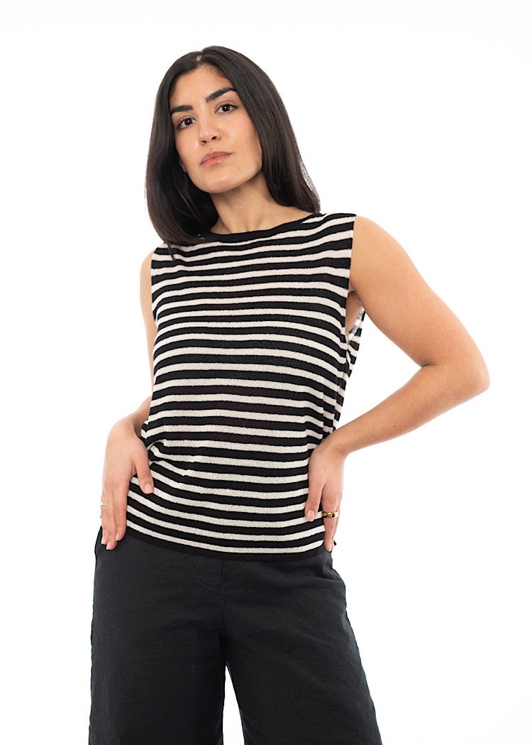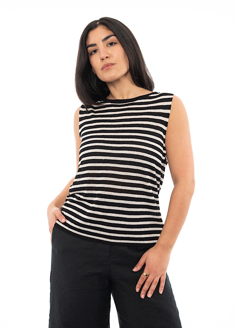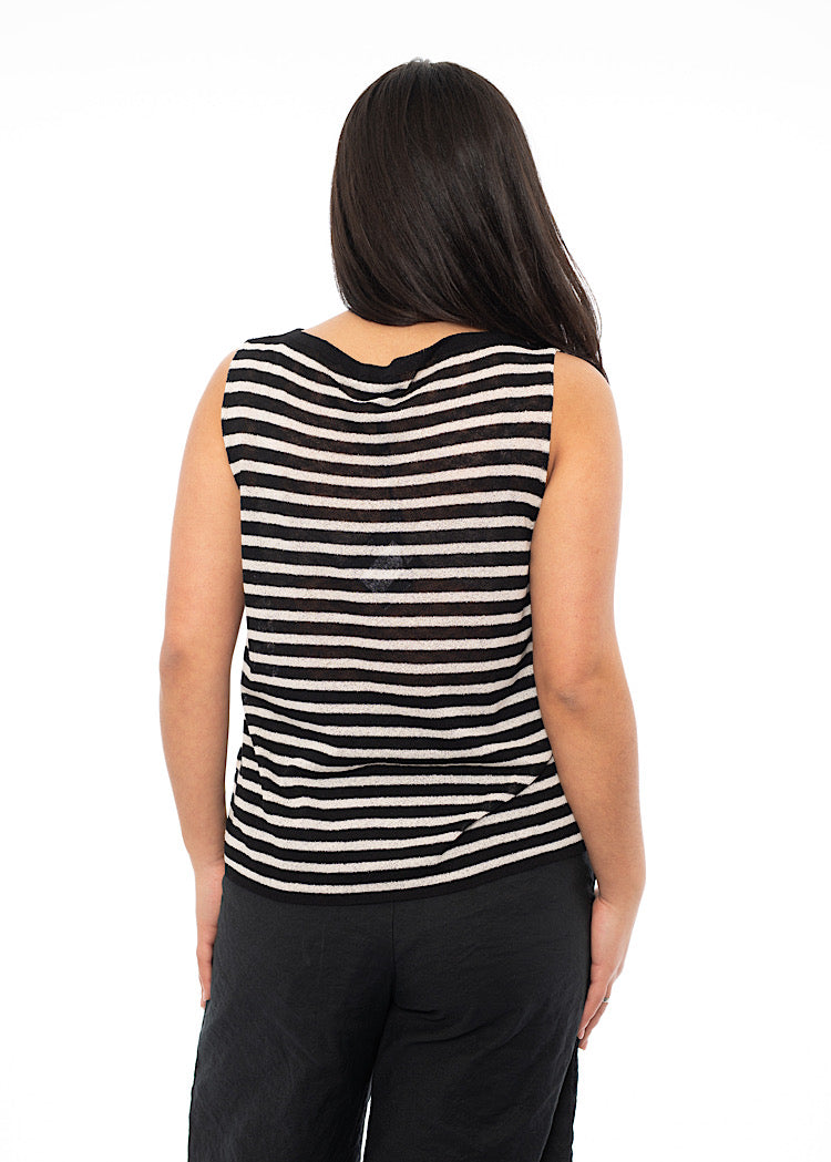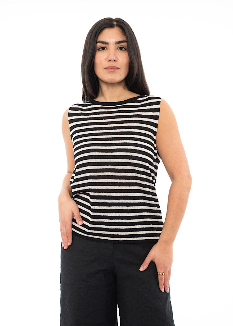 A lightweight knitted vest from SARAH PACINI Spring/Summer '25. Features include a rounded neckline with a sleeveless design. Finished in a semi-sheer monochromatic Viscose fabric.