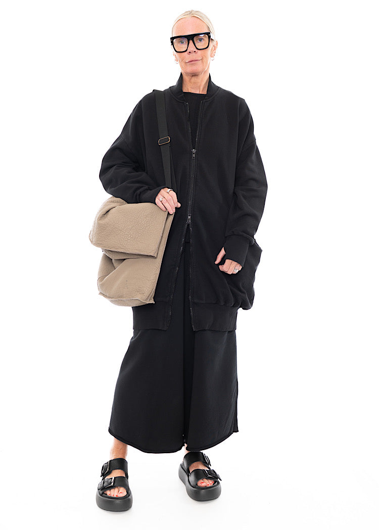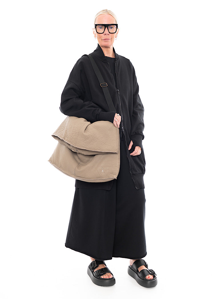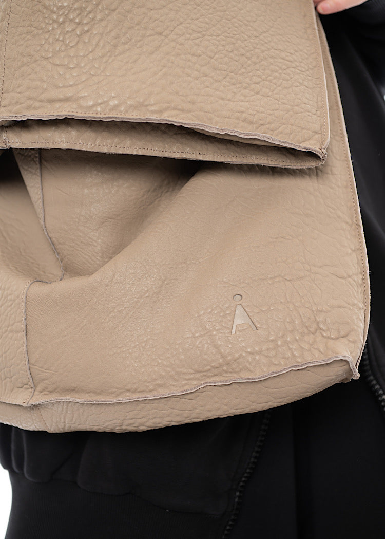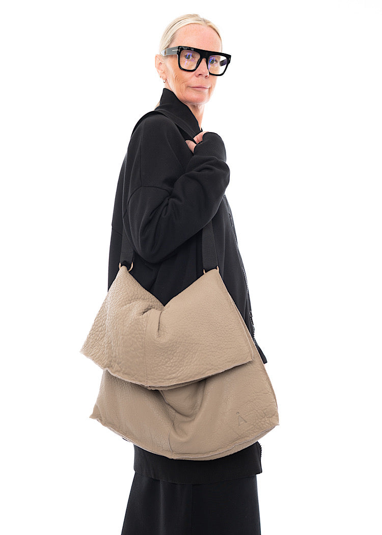 A full Leather Bag from SORT AARHUS in a textured finish. Features include an adjustable large strap which can be detached if desired. A popper button to fasten along with a zipper compartment inside.