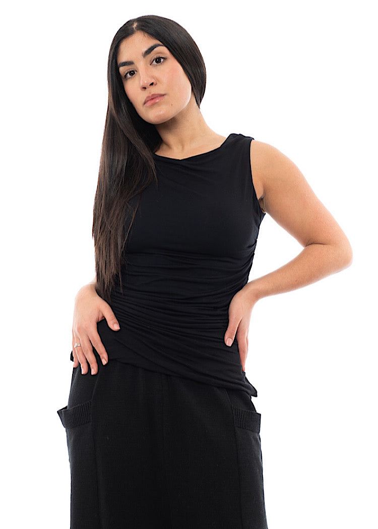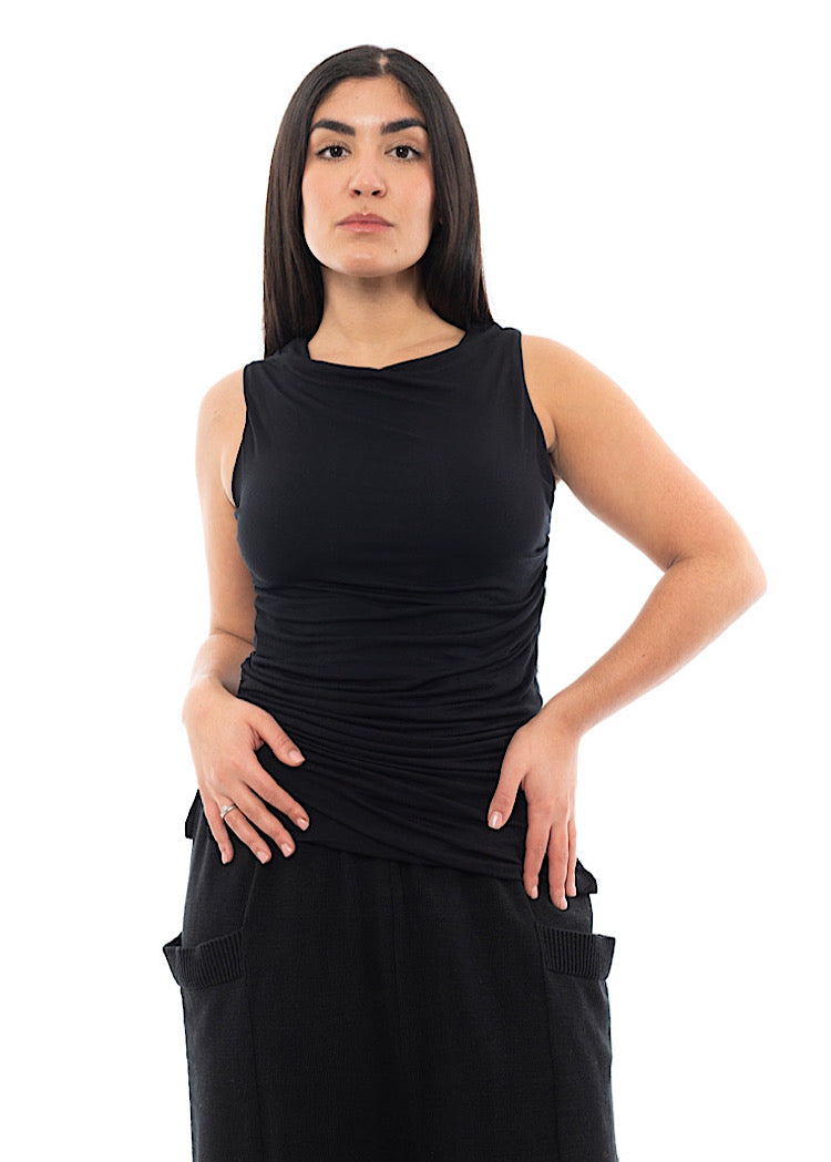 A lightweight, sleeveless Top from SORT AARHUS in a Viscose-mix fabric. Features include a round neckline, gathering details at the shoulders and sides to create a ruched look and finished with vents at the hemline.